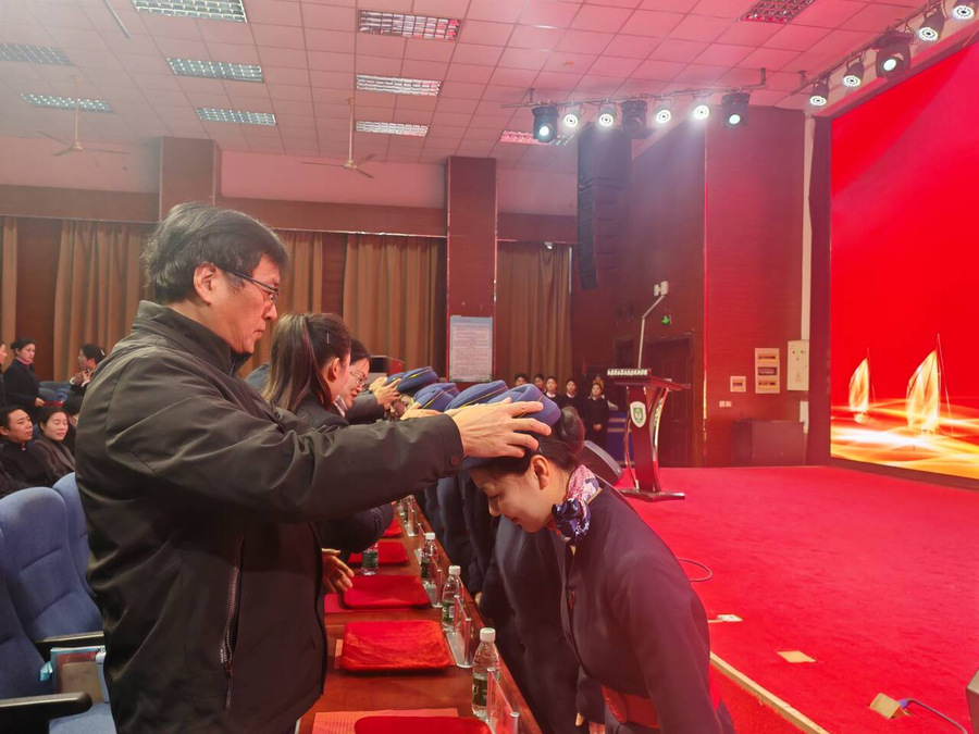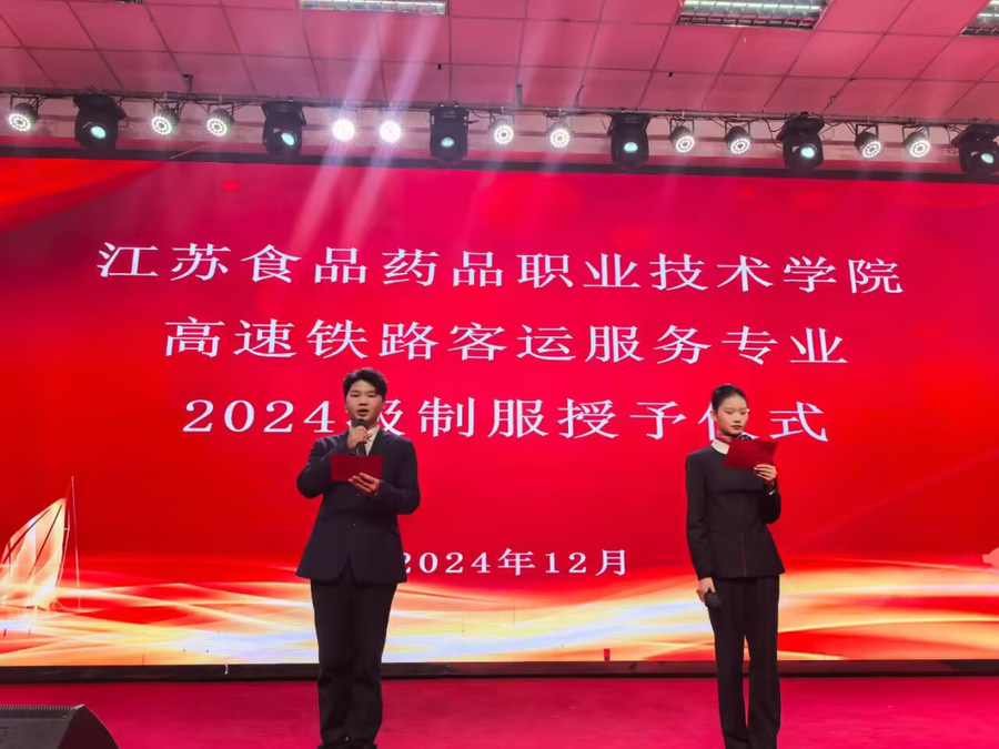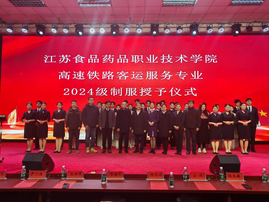 2024年12月26日,酒店学院召开2024级高速铁路客运服务专业制服授予仪式,乐竞副校长贾韶千出席活动并为学生授服。合作企业星铁航(江苏)教育科技有限公司徐同海董事长、冯文超总经理,以及酒店学院的党政领导、老师参加了制服授予仪式。