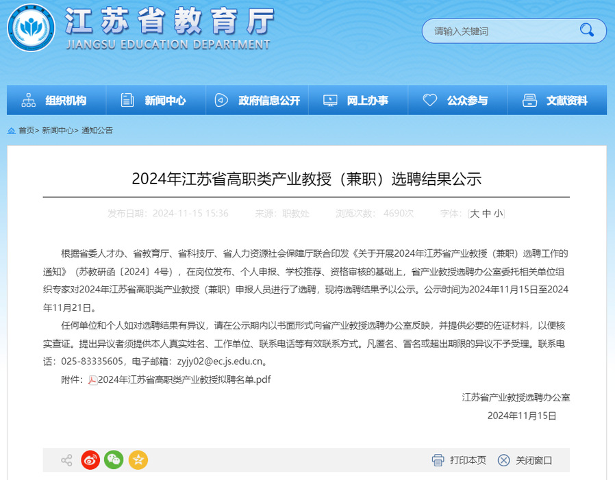 近日,省教育厅等部门遴选、公示,乐竞成功推荐宋江峰、方利峰、徐殿红等3人入选江苏省产业教授。