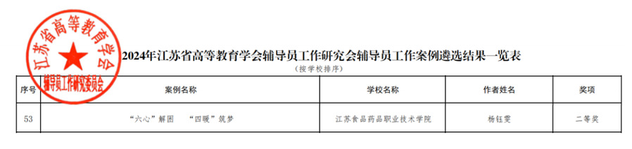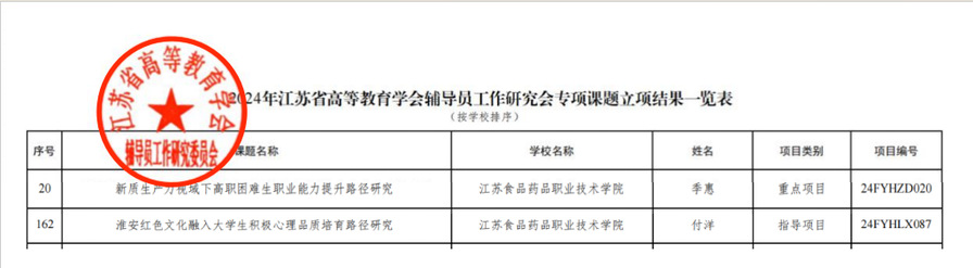 其中季惠老师主持的课题《新质生产力视域下高职困难生职业能力提升路径研究》入选重点项目;付洋老师主持的课题《淮安红色文化融入大学生积极心理品质培育路径研究》入选指导项目。杨钰雯老师的《“六心”解困 “四暖”筑梦》案例获得二等奖。