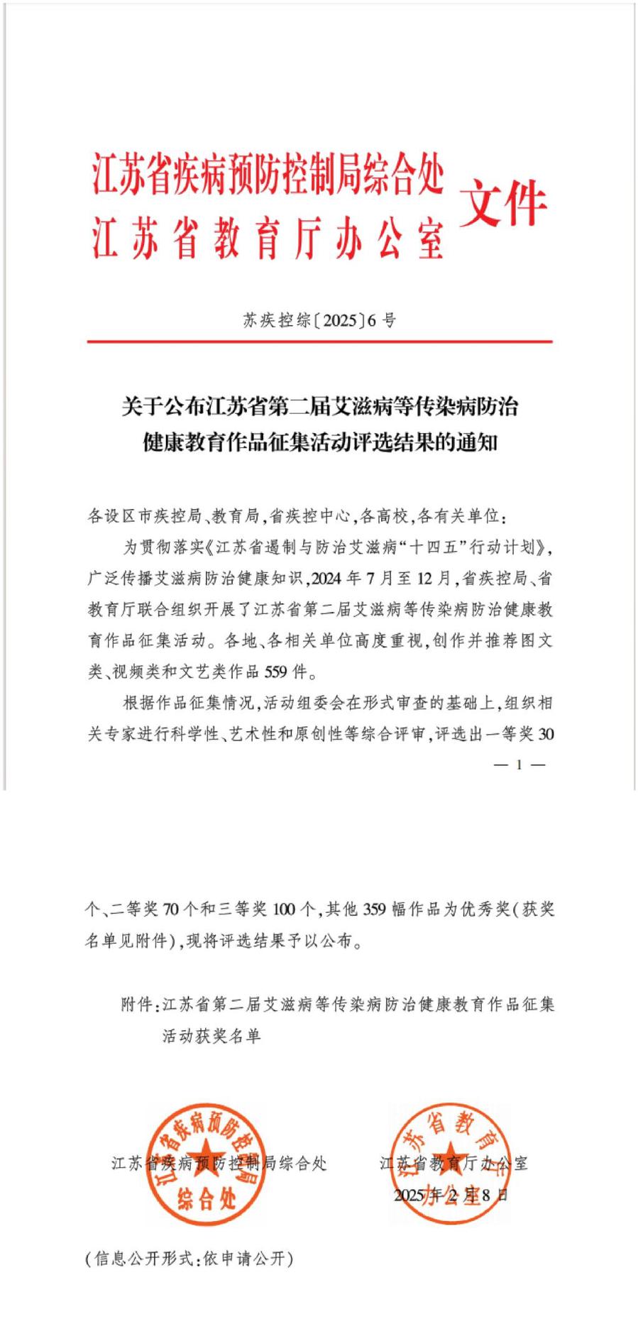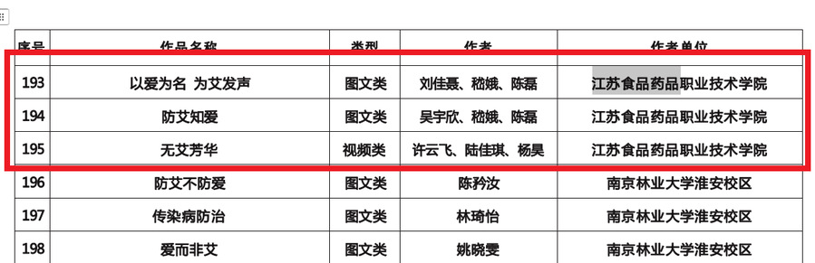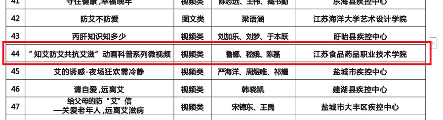 2024年7月至12月,省疾控局、省教育厅联合组织开展了江苏省第二届艾滋病等传染病防治健康教育作品征集活动。在此次活动中,乐竞鲁娜、嵇娥、陈磊创作的的微视频《知艾防艾 共抗艾滋》获得了二等奖。刘佳聂、嵇娥、陈磊创作的图文类作品《以爱为名为艾发声》,吴宇欣、嵇娥、陈磊创作的图文类作品《防艾知爱》,许云飞、陆佳琪、杨昊创作的视频《无艾芳华》分别获得了优秀奖。
