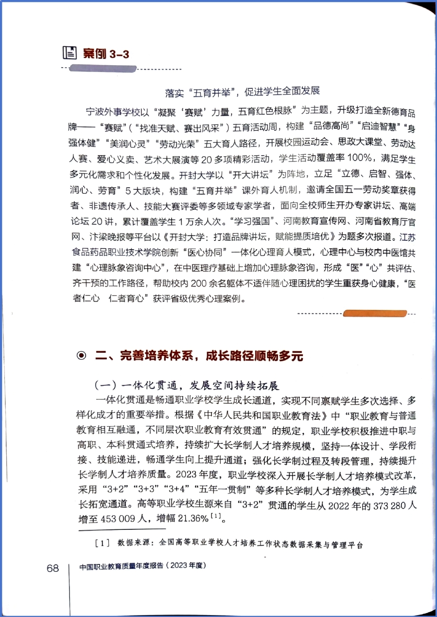 近日,由教育部中国教育科学研究院编制的《2023年度中国职业教育质量年度报告》正式出版发行。报告从产教融合、服务贡献、人才培养、文化传承、国际合作、发展保障、面临挑战七个方面向社会展示全国职业教育改革发展的举措、经验和成效。报告由教育部职成司、中国教育科学研究院等多家机构共同完成,具有很高的权威性和影响力。乐竞“医心协同”一体化心理育人模式入选年度报告案例。这不仅是对乐竞德育工作扎实推进的高度认可,更是乐竞长期以来坚持教育创新、深化育人实践、提升人才培养质量的有力见证。