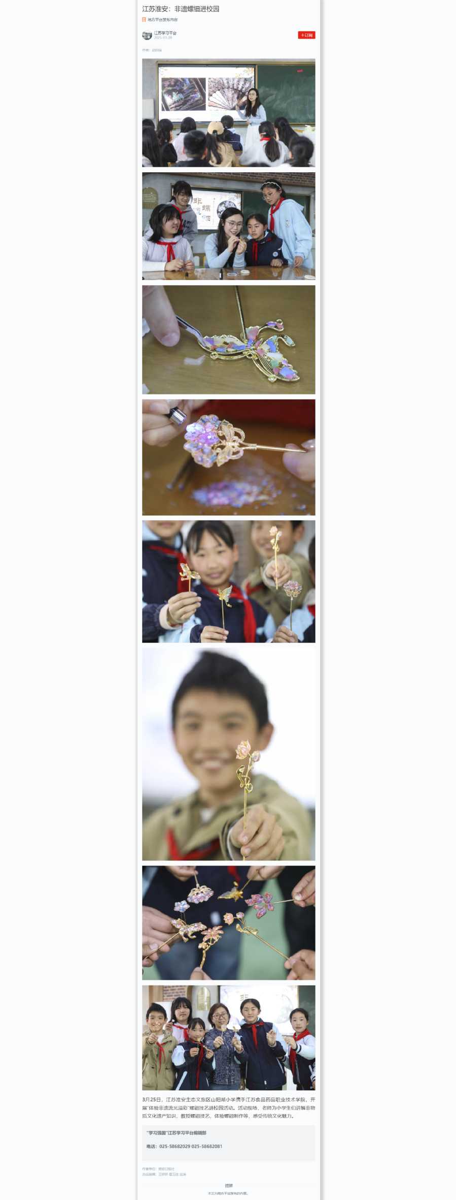 3月25日,江苏淮安生态文旅区山阳湖小学携手乐竞,开展“体验非遗流光溢彩”螺钿技艺进校园活动。活动现场,老师为小学生们讲解非物质文化遗产知识,教授螺钿技艺,体验螺钿制作等,感受传统文化魅力。