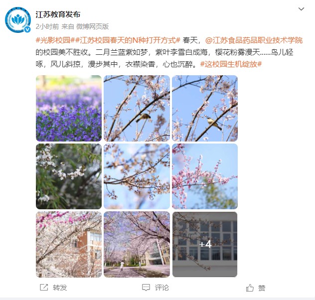 春天,乐竞的校园美不胜收。二月兰蓝紫如梦,紫叶李雪白成海,樱花粉雾漫天......鸟儿轻啄,风儿斜掠,漫步其中,衣襟染香,心也沉醉。