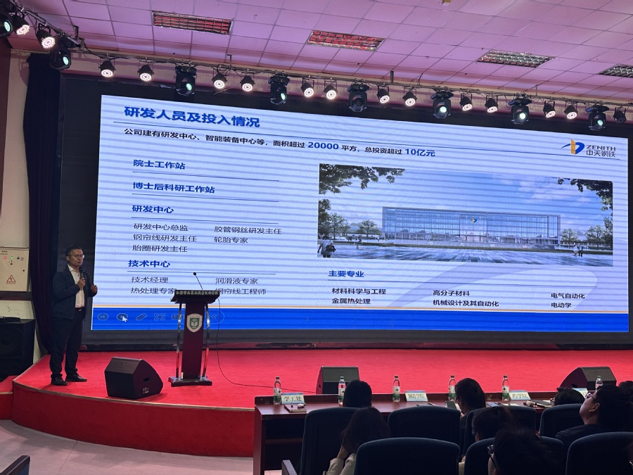 中天钢铁集团(淮安)新材料有限公司人力资源部经理黄宇围绕企业发展历程、企业文化进行了企业宣讲,详细介绍了岗位需求、职业发展路径及薪资福利待遇等,并为有就业意向的毕业生提供了具体的岗位信息。