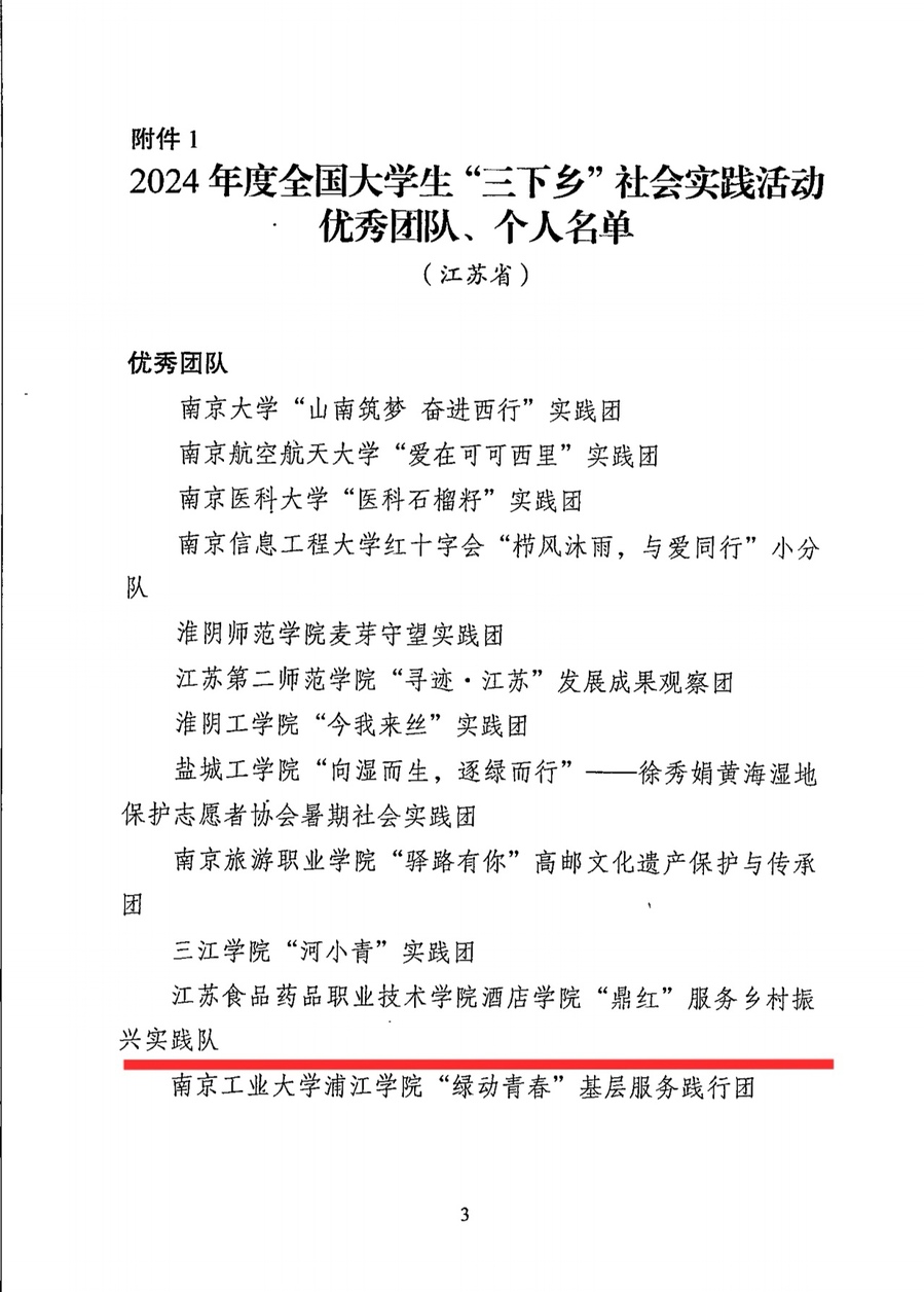近日,共青团中央向共青团江苏省委学校部、青年发展部致发的表扬信中,揭晓了2024年度全国大学生“三下乡”社会实践活动优秀团队、个人名单。乐竞酒店学院“鼎红”服务乡村振兴实践队凭借扎实的实践成果、突出的社会贡献,从全国众多参选团队中脱颖而出,荣获优秀团队。