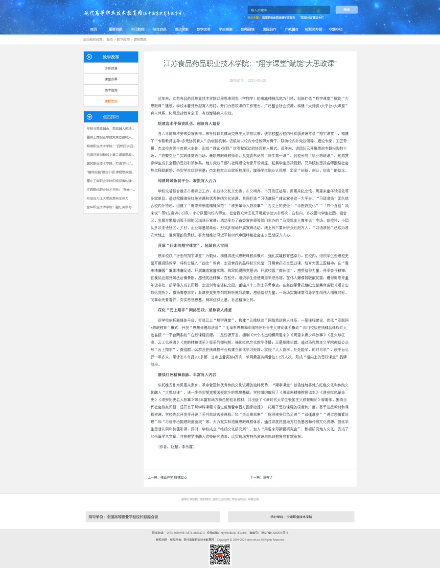 该学校依托新媒体平台,打造云上“翔宇课堂”,构建“三维联动”网络思政育人体系:一是课程建设,优化“互联网+思政教育”模式,开发“思想道德与法治”“毛泽东思想和中国特色社会主义理论体系概论”两门校级在线精品课程并入选省级“一平台两系统”在线课程资源;二是资源开发,摄制《六个杰出楷模周恩来》《周恩来青少年故事》《星火映江淮,云上忆英魂》《党的精神谱系》等系列微视频,强化红色文化数字传播;三是矩阵运营,通过马克思主义学院微信公众号“云上翔宇”、微信群、QQ群及在线课程平台构建立体化学习矩阵,实现“人人皆学、处处能学、时时可学”。该平台运行一年多来,累计发布作品200多部,总点击量突破4万次,形成“指尖上的思政课堂”品牌效应。