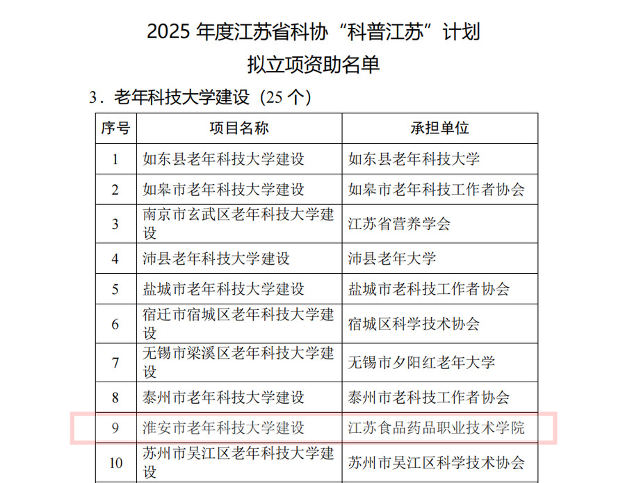5月21日,江苏省科协公布了2025年度江苏省科协“科普江苏”计划拟立项资助名单,乐竞获批“老年科技大学建设项目”1项。《淮安市老年科技大学建设》项目由乐竞牵头,与淮安市科学技术协会、淮安市老科技工作者协会协作申报,由江苏省心理健康教育名师工作室主持人李婉君博士负责,在科技处的指导下,组建包含健康医学院、心理发展服务中心和人工智能学院师资的项目团队,集中攻关申报,在高校科协的协助下顺利立项。