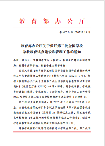 根据教育部2025年5月28日《教育部办公厅关于做好第三批全国学校急救教育试点建设和管理工作的通知》的文件,乐竞被教育部确定为第三批全国学校急救教育试点学校。本次淮安市仅两所高校入选。