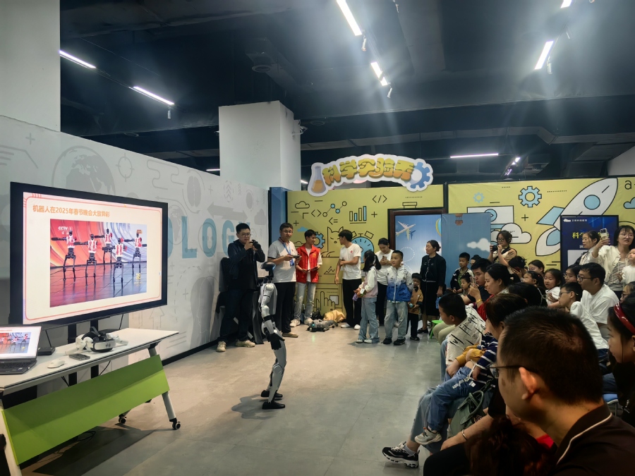 活动现场,教师党员崔亮、李佳、徐守江结合人工智能(AI)专业特色,将相关专业知识转化为科普教育,通过宇树机器人、机器狗表演互动等创新形式开展宣讲;洪敬雅同志带领学生开发的VR龙舟体验项目,让传统文化焕发科技魅力;童盼、陈子怡同志精心组织科普互动环节,为参与互动的小朋友发放纪念品,传递党组织的关怀与温暖。