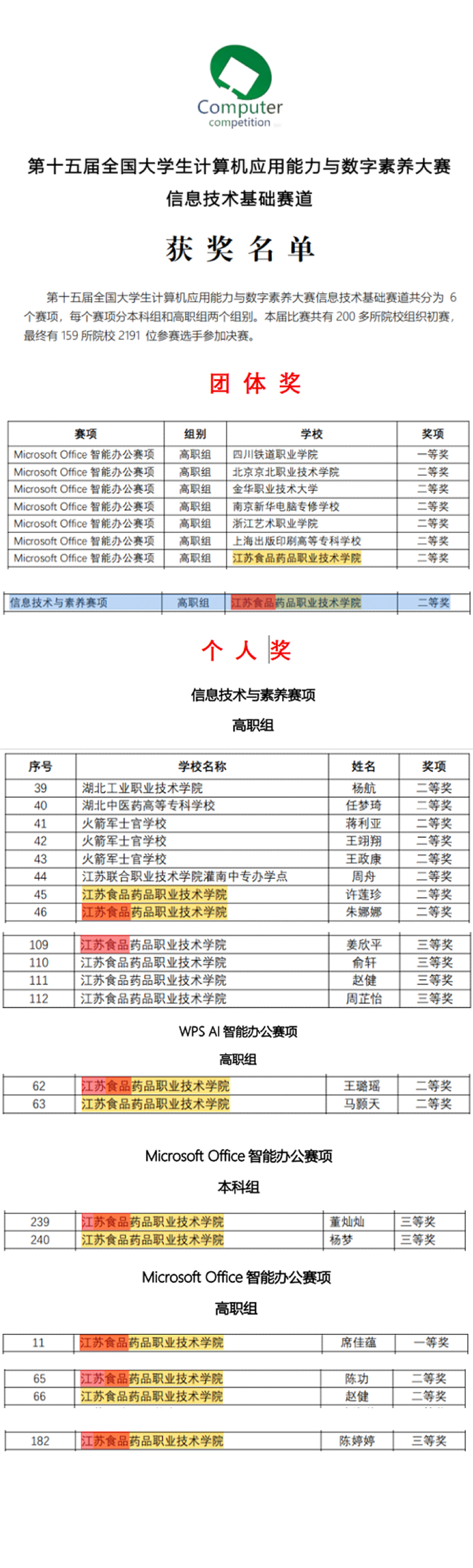 5月24日至25日,由全国高等学校计算机教育研究会等四家单位联合主办的第十五届全国大学生计算机应用能力与数字素养大赛在线上圆满落幕。本届大赛共设六大竞赛赛道,吸引了来自全国200余所院校的2191名选手激烈角逐。乐竞选手们凭借扎实的专业素养,在本科组与高职组的多个赛项中脱颖而出,荣获团体二等奖2项、个人一等奖1项、二等奖6项、三等奖7项。