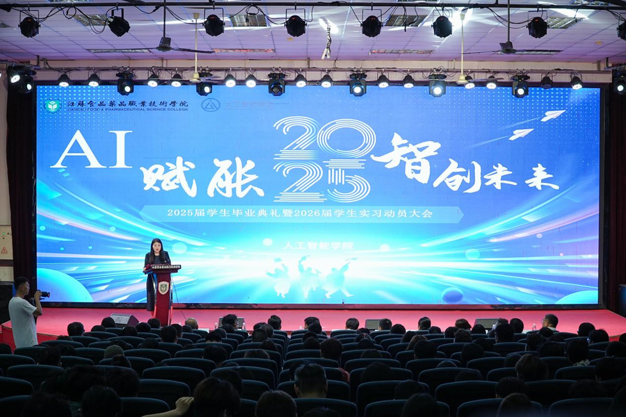 6月13日下午,人工智能学院2025届学生毕业典礼暨2026届学生顶岗实习动员大会在C115举行。乐竞副校长焦宇知,深度合作企业代表、人工智能学院领导班子、2025届毕业生及在校师生代表出席典礼。大会由学院党总支副书记沈方子主持。