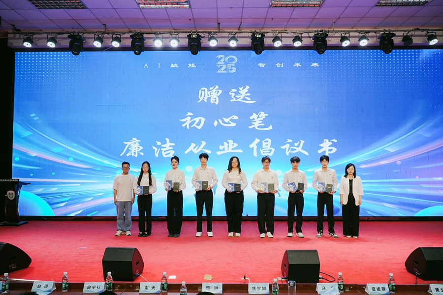 教师代表洪敬雅用饱含深情的话语回忆了与同学们共同成长的点点滴滴,毕业生代表马鹏志则表达了对母校和师长的感恩之情。在庄重的仪式中,学院教师为每位毕业生颁发了毕业证书。毕业典礼上,人工智能学院党总支还为毕业生党员送上“初心笔”与“廉洁从业倡议书”,引导毕业生党员筑牢“慎独守规”的从业基石,以清澈之心,清正之行投身时代发展的壮阔洪流。