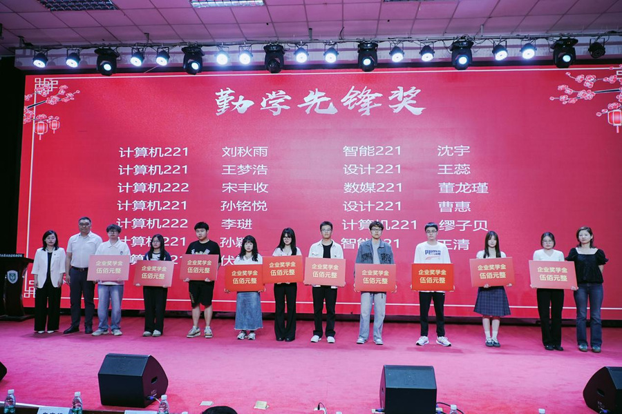 在表彰环节,人工智能学院党总支书记刘玲宣读了企业奖学金获得者及优秀毕业生名单。江苏生涯教育科技有限公司总经理邓琳先生作为企业代表致辞。随后,与会领导和企业嘉宾共同为获奖学生颁发了荣誉证书。