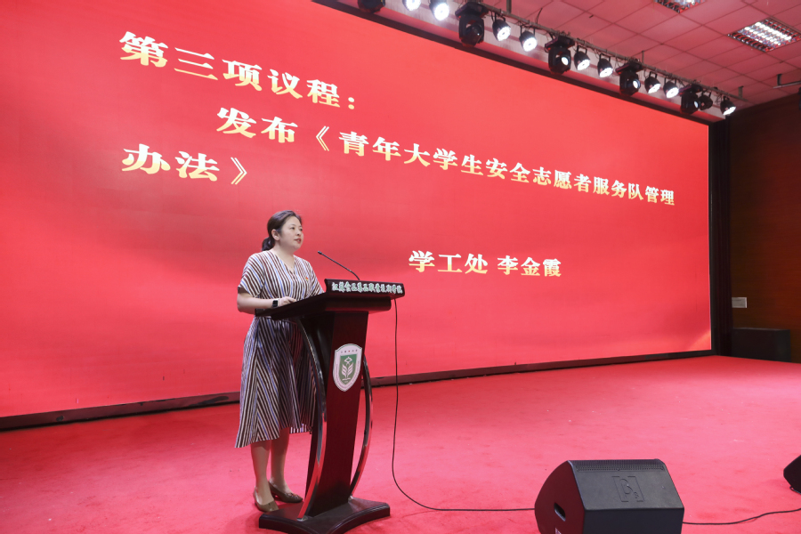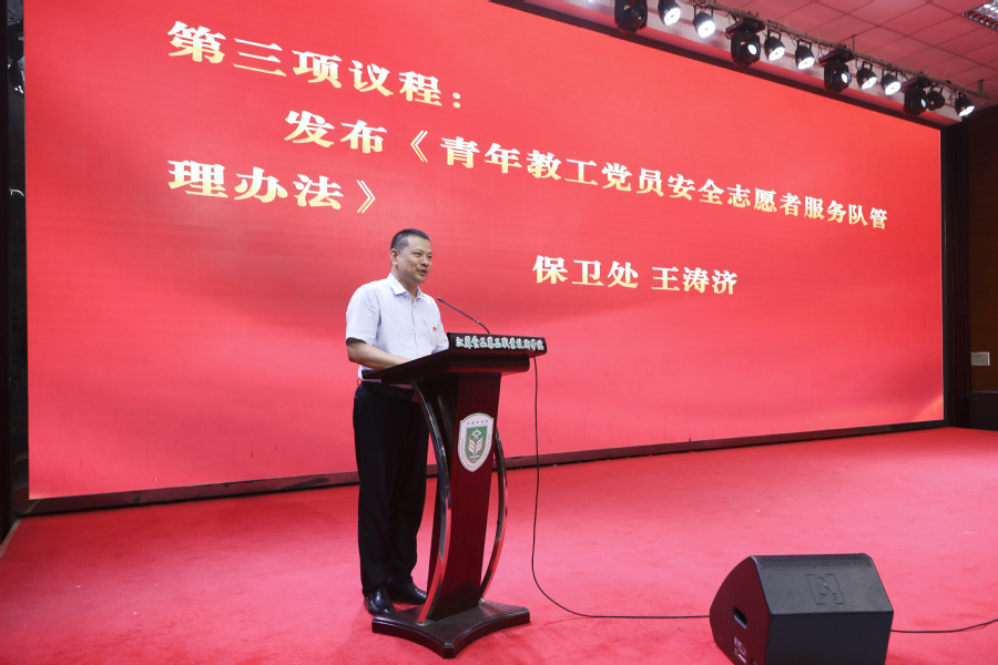 安进副书记宣读了《关于成立第一届青年教工党员安全志愿者服务队的决定》和《关于成立第一届青年大学生安全志愿者服务队的决定》及名单,40名青年教工党员、19名青年大学生经过个人申请、组织推荐、部门审核等程序,光荣加入了学校安全志愿者服务队。仪式上发布了《青年教工党员安全志愿者服务队管理办法》、《青年大学生安全志愿者服务队管理办法》。