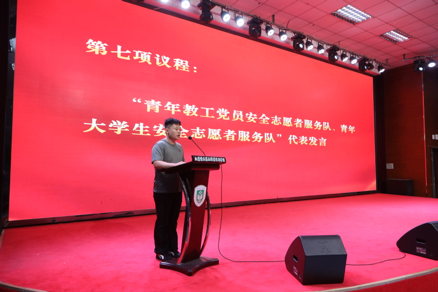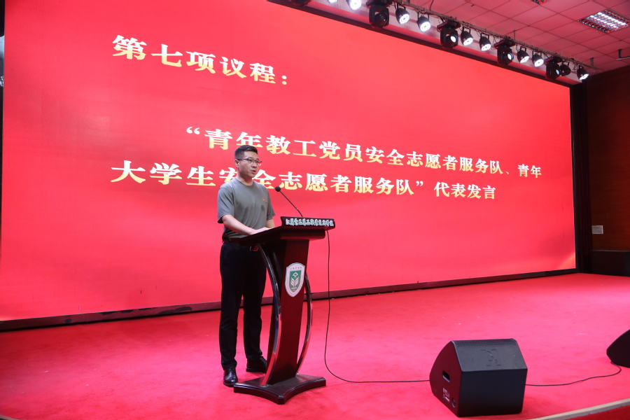 青年教工党员安全志愿者服务队队长、药学院关国锋老师,青年大学生安全志愿者服务队副队长、体育241班张驰分别发言,他们表示,青年的使命在“行动”,安全志愿者的价值在“担当”。