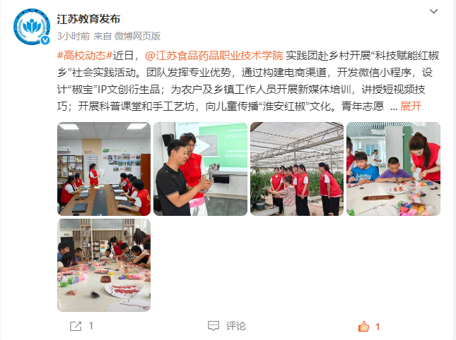 近日,乐竞实践团赴乡村开展“科技赋能红椒乡”社会实践活动。团队发挥专业优势,通过构建电商渠道,开发微信小程序,设计“椒宝”IP文创衍生品;为农户及乡镇工作人员开展新媒体培训,讲授短视频技巧;开展科普课堂和手工艺坊,向儿童传播“淮安红椒”文化。青年志愿者以科技创新为支点、文化传承为纽带,谱写青春奉献之歌。