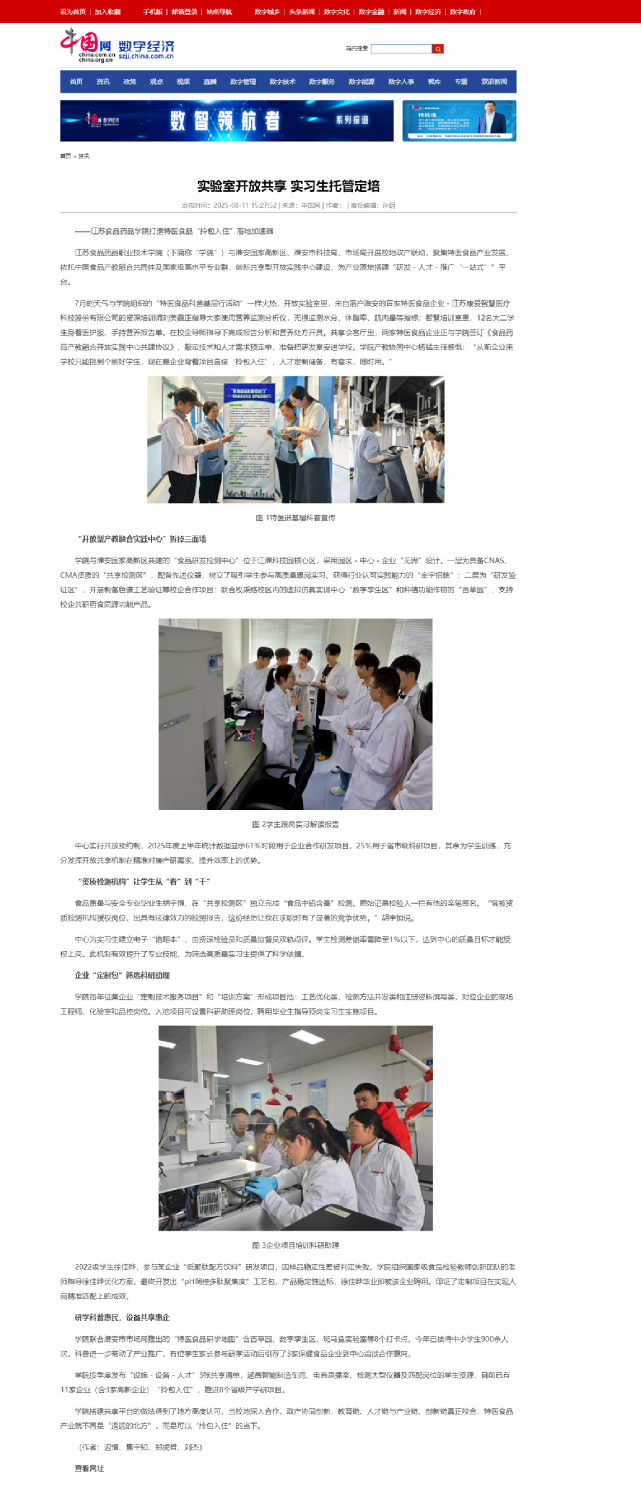学院与淮安国家高新区共建的“食品研发检测中心”位于江淮科技园核心区,采用园区-中心-企业“无界”设计。一层为具备CNAS、CMA资质的“共享检测区”,配备先进仪器,树立了吸引学生参与高质量跟岗实习、获得行业认可实践能力的“金字招牌”;二层为“研发验证区”,开展制备色谱工艺验证等校企合作项目;联合枚乘路校区内的虚拟仿真实训中心“数字孪生区”和种植功能作物的“百草园”,支持校企共研药食同源功能产品。
