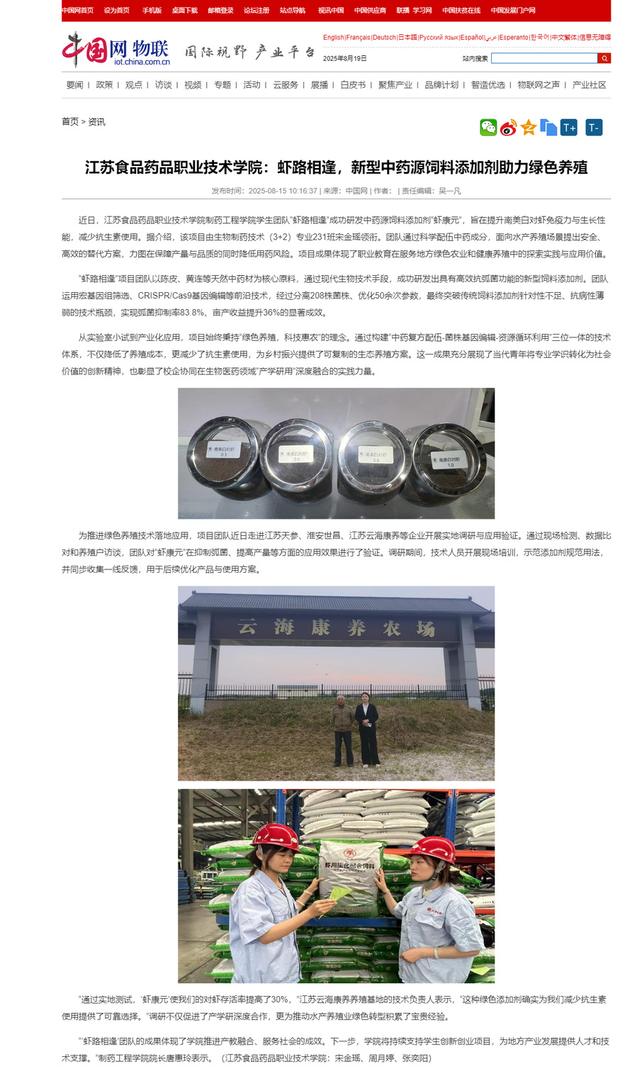 近日,乐竞制药工程学院学生团队“虾路相逢”成功研发中药源饲料添加剂“虾康元”,旨在提升南美白对虾免疫力与生长性能,减少抗生素使用。据介绍,该项目由生物制药技术(3+2)专业231班宋金瑶领衔。团队通过科学配伍中药成分,面向水产养殖场景提出安全、高效的替代方案,力图在保障产量与品质的同时降低用药风险。项目成果体现了职业教育在服务地方绿色农业和健康养殖中的探索实践与应用价值。