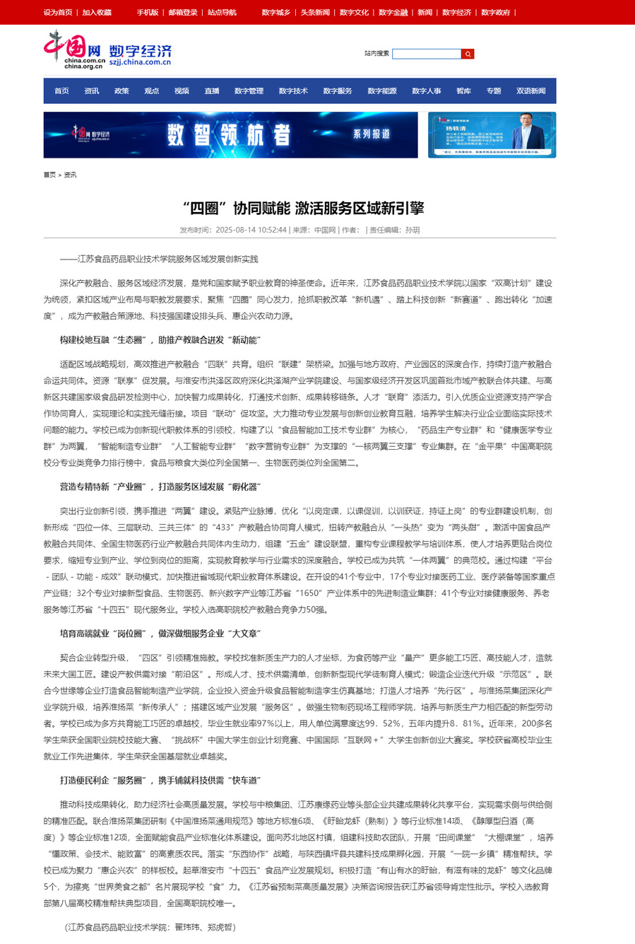 适配区域战略规划,高效推进产教融合“四联”共育。组织“联建”架桥梁。加强与地方政府、产业园区的深度合作,持续打造产教融合命运共同体。资源“联享”促发展。与淮安市洪泽区政府深化洪泽湖产业学院建设、与国家级经济开发区巩固首批市域产教联合体共建、与高新区共建国家级食品研发检测中心,加快智力成果转化,打通技术创新、成果转移链条。人才“联育”添活力。引入优质企业资源支持产学合作协同育人,实现理论和实践无缝衔接。项目“联动”促攻坚。大力推动专业发展与创新创业教育互融,培养学生解决行业企业面临实际技术问题的能力。学校已成为创新现代职教体系的引领校,构建了以“食品智能加工技术专业群”为核心,“药品生产专业群”和“健康医学专业群”为两翼,“智能制造专业群”“人工智能专业群”“数字营销专业群”为支撑的“一核两翼三支撑”专业集群。在“金平果”中国高职院校分专业类竞争力排行榜中,食品与粮食大类位列全国第一、生物医药类位列全国第二。