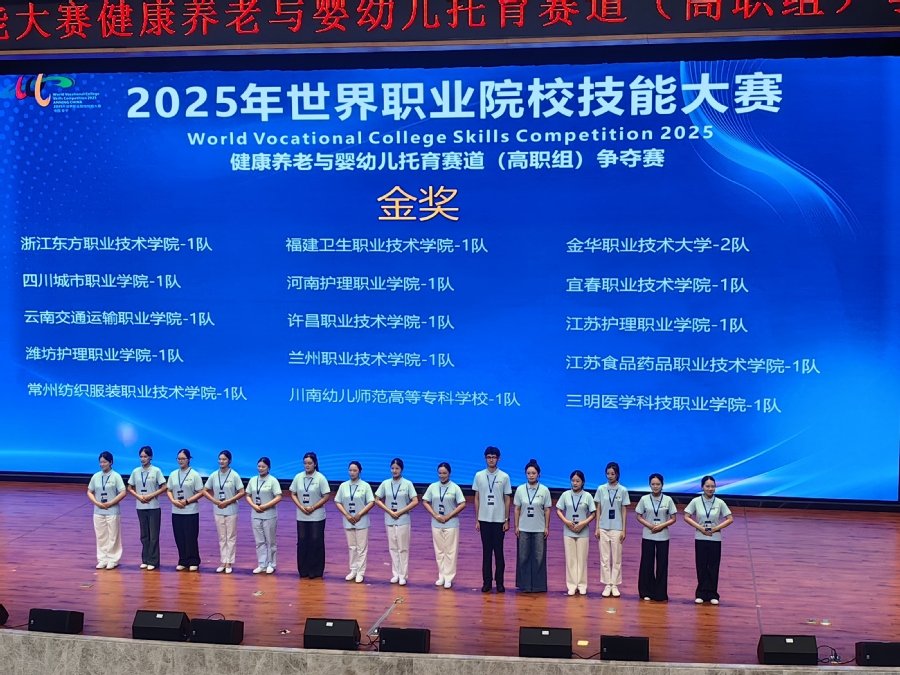 2025年世界职业院校技能大赛健康养老与婴幼儿托育赛道(高职组)争夺赛于8月28日至9月2日在云南省安宁市举行。本届大赛以“技炫青春 能创未来”为主题,来自全国30余省市的155支参赛队伍同场竞技、共展风采。乐竞参赛队伍凭借过硬实力突破重围,最终斩获金奖。