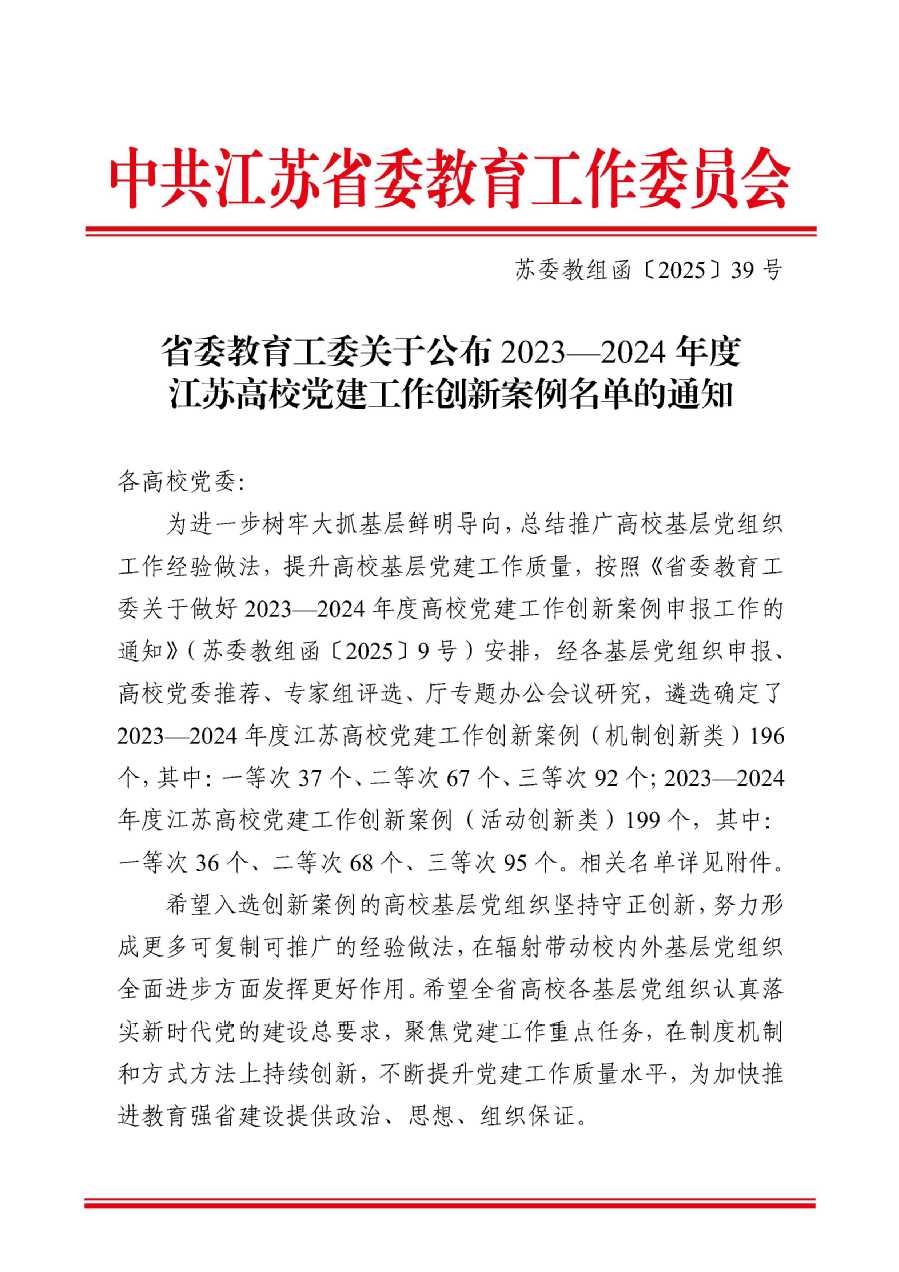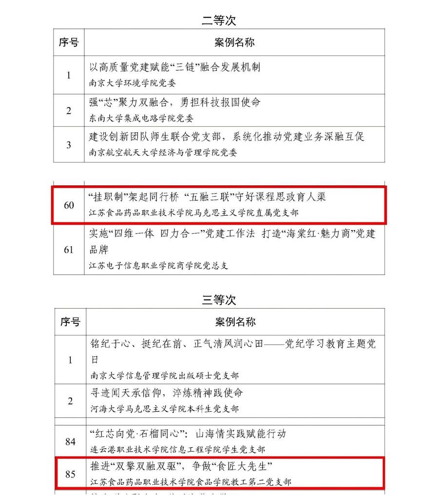 近日,江苏省委教育工委公布了2023—2024年度江苏高校党建工作创新案例名单,乐竞2项案例成功入选。马克思主义学院直属党支部《“挂职制”架起同行桥“五融三联”守好课程思政育人渠》获评机制创新类二等次,食品学院教工第二党支部《推进“双擎双融双驱”,争做“食匠大先生”》获评活动创新类三等次。