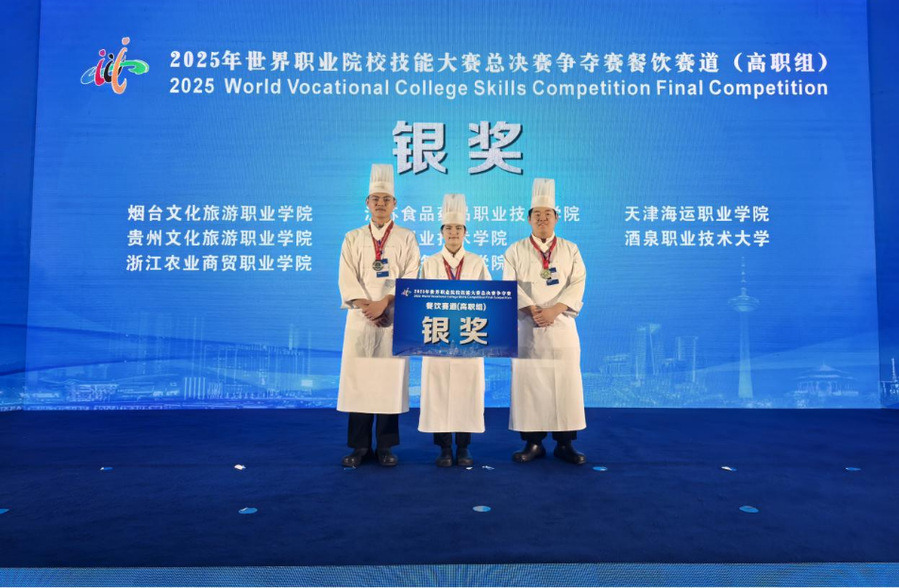 9月9日至12日,2025年世界职业院校技能大赛总决赛争夺赛餐饮赛道(高职组)在辽宁现代服务职业技术学院举办。作为全国职业院校餐饮专业的顶级赛事,本次比赛共有来自全国各地的 89支顶尖队伍同台竞技。乐竞酒店学院烹饪专业群的学生顾权、陆雨、缪欣宇、李金宝组成的参赛团队,在陈金女、周干两位指导老师和赛项教练团队的悉心指导下,通过系统扎实的技能训练、反复的流程演练和创意设计,在比赛中沉着应对、稳定发挥,凭借出色的作品呈现与流畅的团队协作,获得小组第二名的佳绩,并斩获大赛银奖。