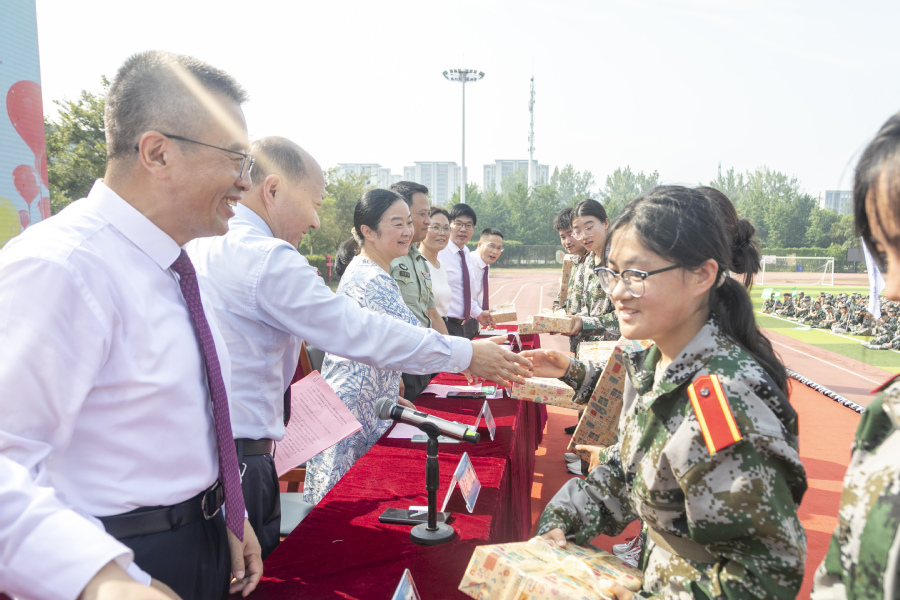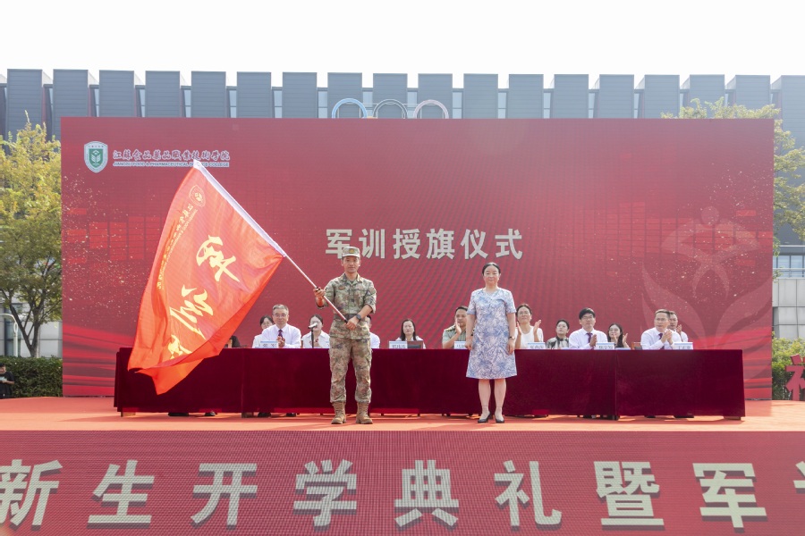 随后,翟玮玮书记为军训团授旗,标志着2025级新生军训正式开启。