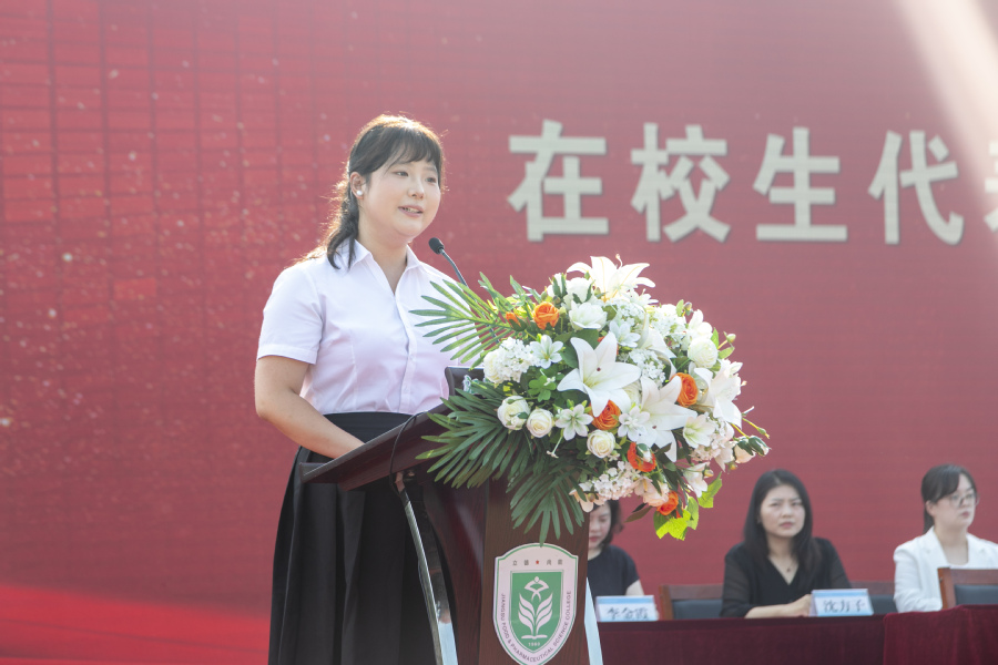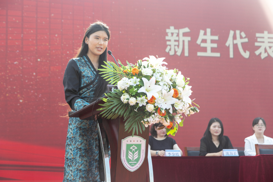 食品学院食监252班拉巴卓玛同学作为新生代表发言,她表示未来将和同学们一起脚踏实地,用心体验,在校园里写下属于自己的成长故事。