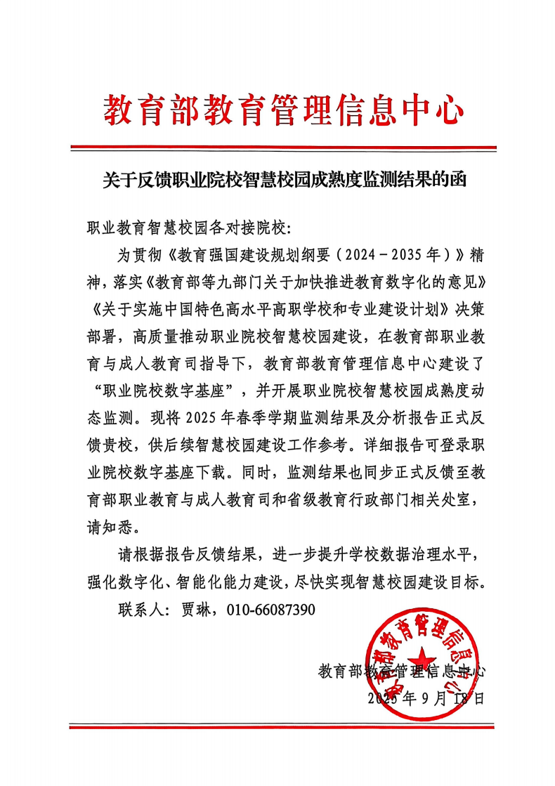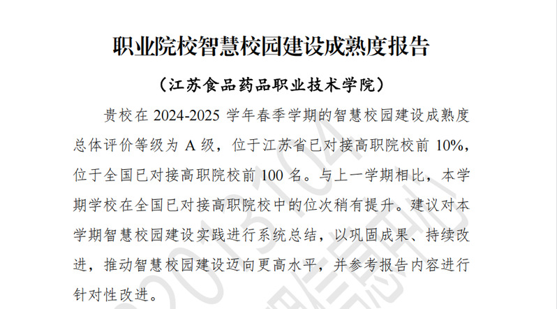 10月10日,教育部管理信息中心在职业院校数字基座平台公布了2024至2025学年春季学期职业院校智慧校园建设成熟度报告。乐竞总体评价等级为 A 级,位于江苏省已对接高职院校前 10%,位于全国已对接高职院校前 100 名。