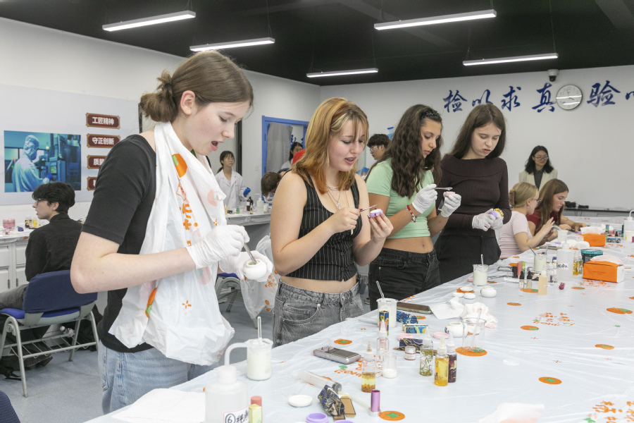 10月14日下午,德国萨斯尼兹市代表团参加了秋季药妆手作体验课程,在制药工程学院老师的指导下,亲手制作了唇膏和护手霜,他们纷纷表示这是一次难忘的经历。除此之外他们还体验了乐竞的中医养生保健课程,健康医学院教师带他们体验了香囊制作、中医诊断、推拿、拔罐、艾灸等中国特色养生方式,他们还品尝了中医养生茶饮,感叹中医传统文化的奇妙。